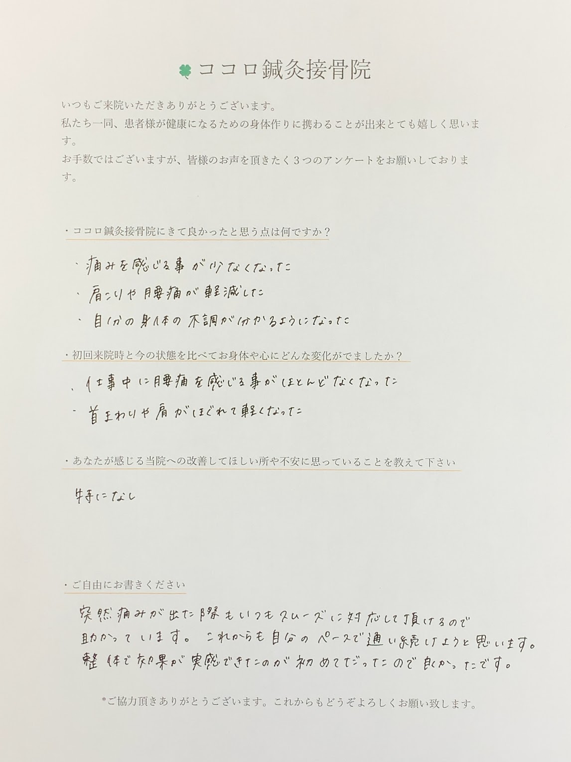 治療をしていくうちに徐々に痛みが改善し、今では痛みを感じる事が少なくなりました。