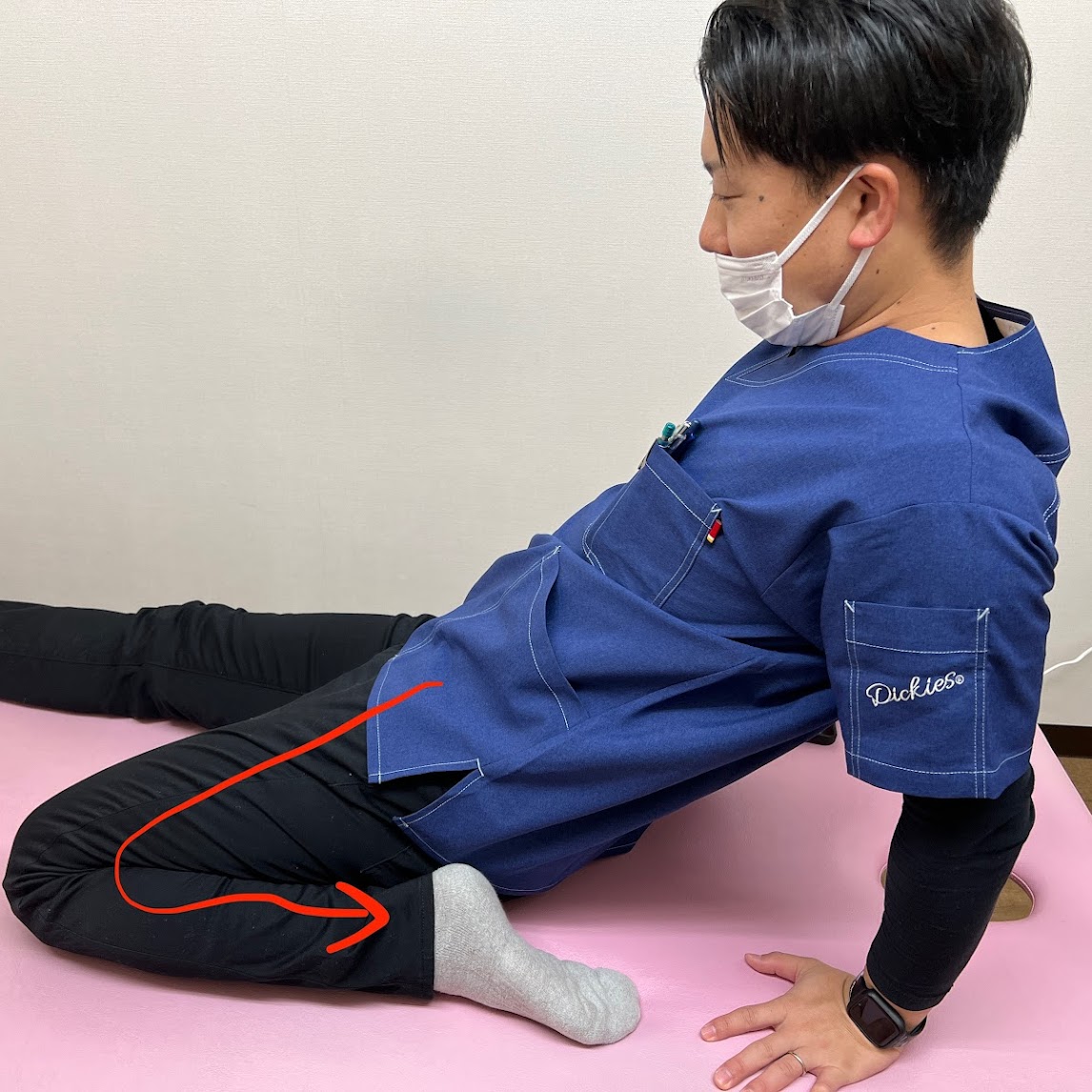 その状態から後に倒れていくとモモの前が伸びていく感覚があると思いますので、10秒×3セット両足やっていきます。